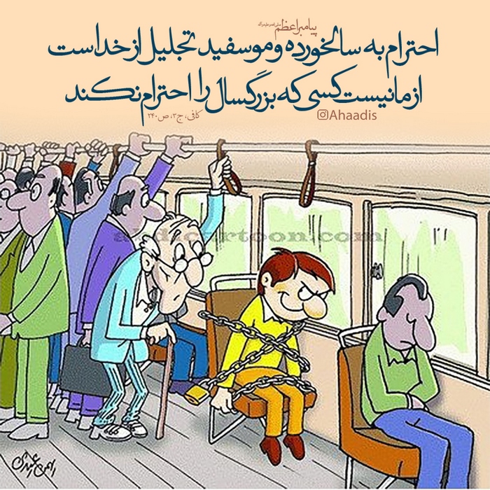 الصَّادِقُ عَلَيْهِ السَّلَامُ: عَظِّمُوا کِبَارَكُمْ وَ صِلُوا أَرْحَامَكُمْ وَ لَیْسَ تَصِلُونَهُمْ بِشَيْءٍ أَفْضَلَ مِنْ کَفِّ الْأَذَى عَنْهُمْ. (کافی ج ۲ ص ۱۶۵) پیران و بزرگان خویش را تعظیم کنید و بزرگ دارید، و با خویشان صله کنید و هیچ صله رحمی بهتر از آزار نرساندن به آنها نیست.